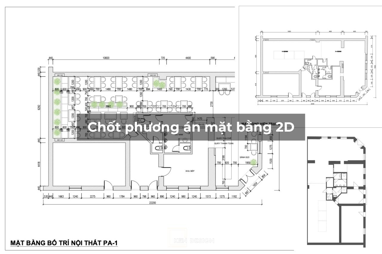 Bản vẽ mặt bằng 2D là nền tảng quan trọng của cả dự án. Ở giai đoạn này, Ken Design sẽ triển khai layout công năng, thể hiện rõ cách phân chia các khu vực như bếp, quầy bar, không gian phục vụ khách và lối giao thông. Bản vẽ giúp chủ đầu tư dễ dàng hình dung sự hợp lý trong việc bố trí không gian, đồng thời đưa ra điều chỉnh kịp thời trước khi chuyển sang bước phối cảnh. Với các công trình ở xa, bản vẽ 2D còn là tài liệu hữu ích để đối chiếu khi đo đạc lại hiện trạng.