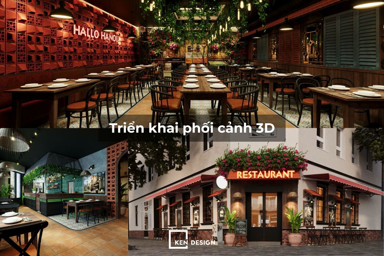 Phối cảnh 3D là bước thể hiện trực quan nhất ý tưởng thiết kế. Ken Design sử dụng hình ảnh mô phỏng 3D để trình bày phương án vật liệu, màu sắc, ánh sáng và cách bố trí đồ nội thất. Chủ đầu tư sẽ nhìn thấy toàn bộ không gian nhà hàng, quán cafe sau khi hoàn thiện, từ đó dễ dàng đóng góp ý kiến và điều chỉnh chi tiết. Trong giai đoạn này, chủ đầu tư có thể cung cấp thêm các vật liệu, đồ nội thất tại nước sở tại để kiến trúc sư thiết kế 3D sát thực tế nhất, tạo điều kiện thuận lợi trong quá trình thi công.