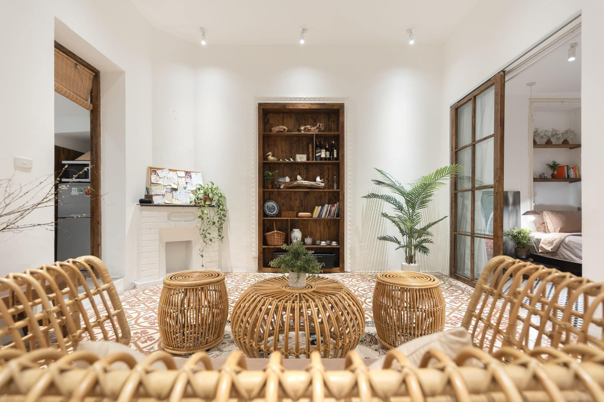 Đầu tiên là tầng 1 của căn nhà. Giá thuê nguyên tầng sẽ là 1.100.000 VNĐ/đêm. Tầng này có diện tích 60m2 bao gồm khu phòng khách, phòng ngủ, khu bếp và khu vệ sinh. Phần lớn nội thất đều rất đơn giản, được sử dụng từ chất liệu gỗ,nan tre, mây giúp tái hiện lại nét đẹp của Hà Nội thời thập niên 90. Điều này sẽ thu hút khách quốc tế đến với Lacaito homestay để khám phá và tìm hiểu về văn hóa Việt Nam xưa.