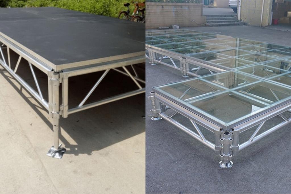 Bề mặt sàn thường sử dụng ván plywood chống ẩm hoặc tấm cemboard kết hợp lớp hoàn thiện chống trượt nhằm đảm bảo an toàn cho người biểu diễn và giảm nguy cơ trơn trượt trong điều kiện thời tiết ẩm ướt.